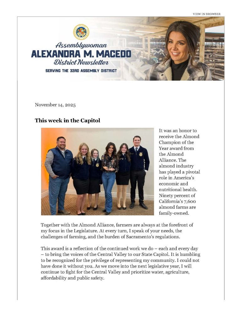 It was an honor to receive the Almond Champion of the Year award from the Almond Alliance. The almond industry has played a pivotal role in America’s economic and nutritional health. Ninety percent of California’s 7‚600almond farms are family-owned.