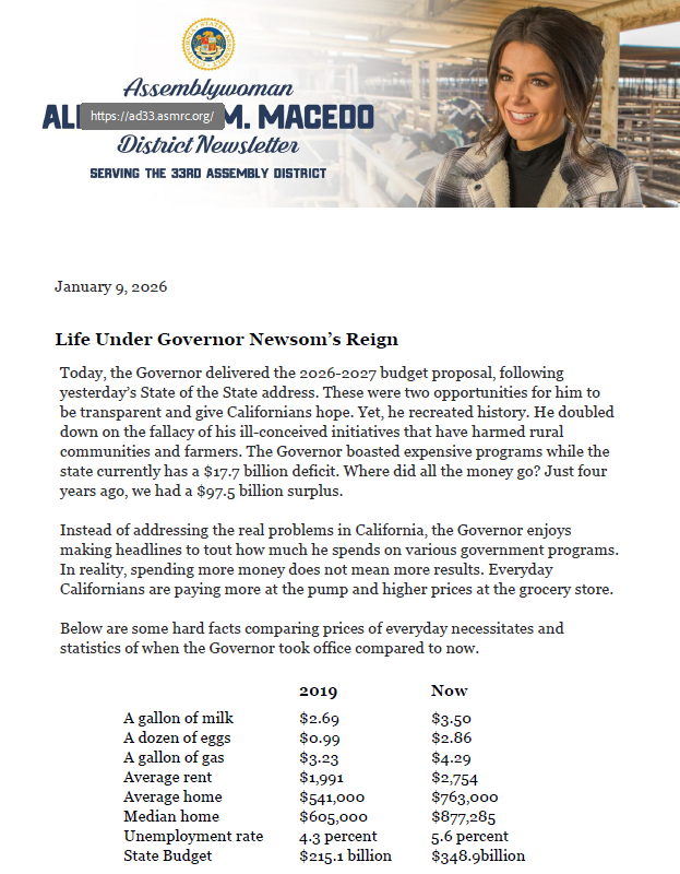 Today‚ the Governor delivered the 2026-2027 budget proposal‚ following yesterday’s State of the State address. These were two opportunities for him to be transparent and give Californians hope. Yet‚ he recreated history. He doubled down on the fallacy of his ill-conceived initiatives that have harmed rural communities and farmers. The Governor boasted expensive programs while the state currently has a $17.7 billion deficit. Where did all the money go? Just four years ago‚ we had a $97.5 billion surplus.