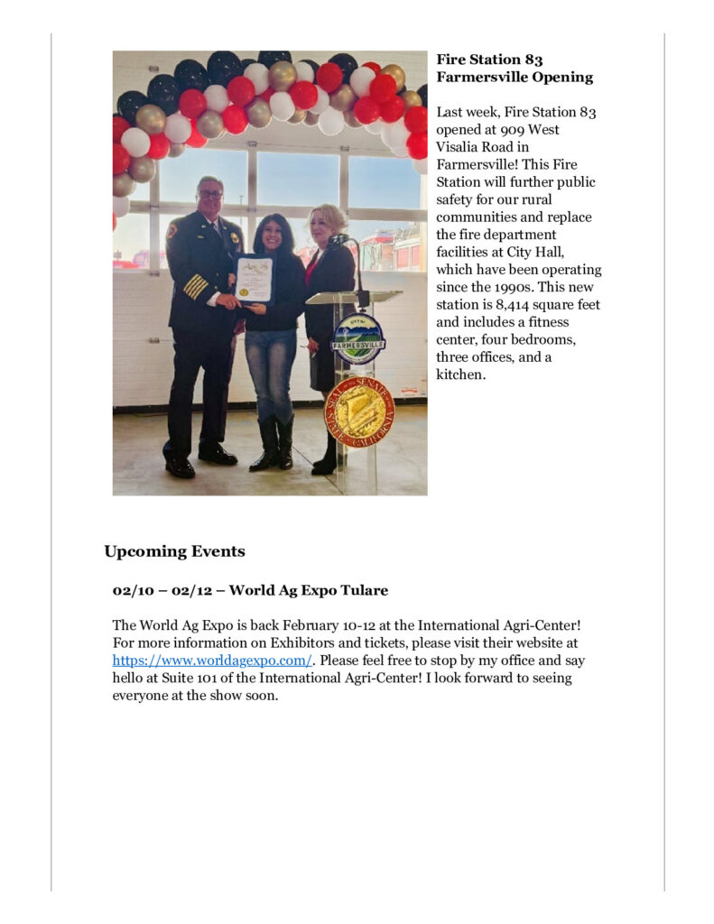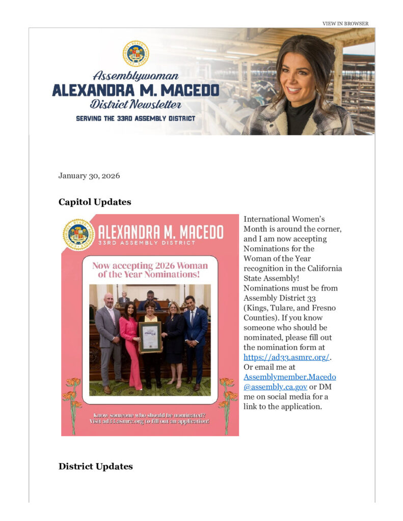 International Women’s Month is around the corner‚ and I am now accepting Nominations for the Woman of the Year recognition in the California State Assembly! Nominations must be from Assembly District 33 (Kings‚ Tulare‚ and Fresno Counties). If you know someone who should be nominated‚ please fill out the nomination form at